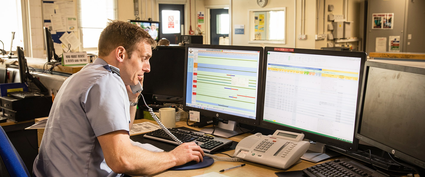 RAF Air Operations Systems Officer using computer while on phone