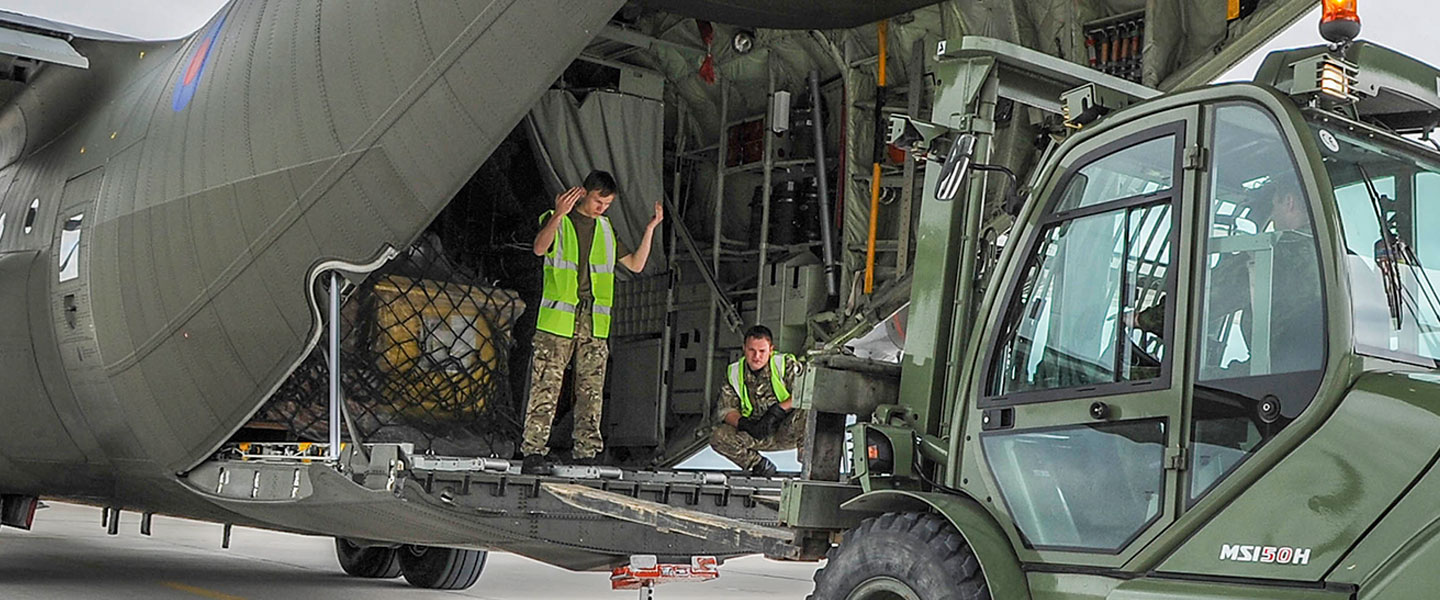 RAF Movers working with telehandler to load cargo to aircraft's rear ramp